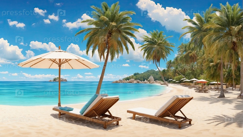 Солнцезащитные кресла под пальмами, маркетинг путешествий, пляжный отдых, УФ-защита, продажи туров, летнее наслаждение, прессовые материалы