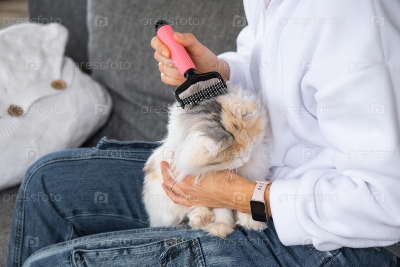 Расчесывание кошки British Fold, удаление маток, длительный уход за шерстью, женщина режет узлы, процесс ухода за домашним животным, здоровая рутина для питомцев