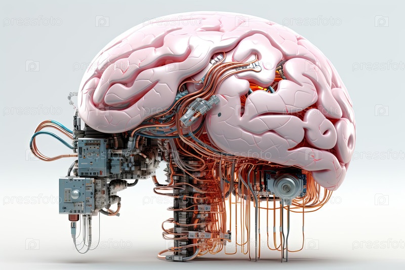 Анатомически реалистичный мозг с встроенными микрочипами, медицинская наука, интерфейсы ИИ, технологии здравоохранения, неврологические инновации, обработка данных