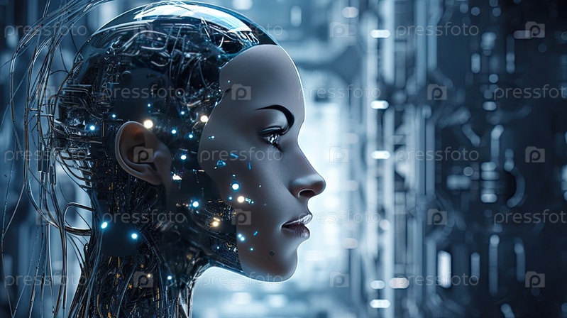 Женское лицо с интегрированными цифровыми схемами, темный технологический фон, современный интеллект, право на текст или дизайн плаката, концептуальное искусство ИИ
