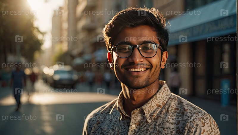 Улыбающийся молодой индийский мужчина в очках, город дневного света, студент университета, современное заболевание зрения, профилактика цифровых глаз, здоровое обучение, пространство баннеров поощрения
