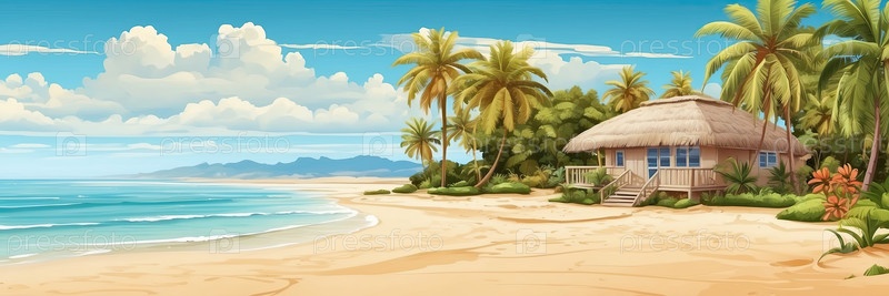 Тропическая хижина с пальмами на бирюзовом море, уединенная аренда со всем включенным, тихий семейный курорт, цифровое рисование мультфильмов, туристический сайт