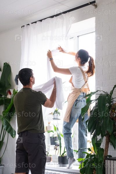 Муж помогает жене с подвешиванием штор, весенней уборкой в солнечной квартире, совместными обязанностями, счастливой командной работой, уютной семейной жизнью, современным декором