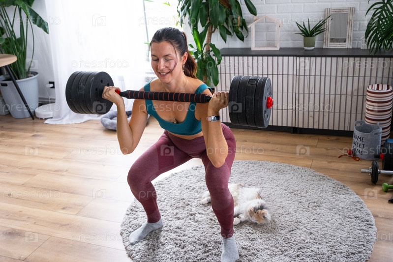Улыбающаяся женщина, выполняющая фитнес-тренировки дома с гантеликами, игривая кошка на уютном ковре, здоровая ежедневная рутина, уход за домашними животными, современный интерьер