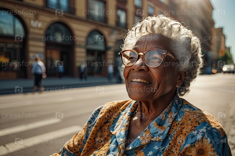 Красивая пожилая чернокожая женщина с белым афро, очки, апельсиновый чек-топ, городская вспышка. катаракта, возрастные изменения сетчатки глаза, нарушения зрения, городской блог красоты, сообщение здравоохранения, зона рассылки новостей