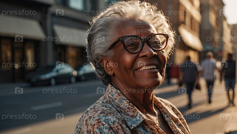 Старушка чернокожая с белыми короткими локонами, прозрачные очки, уверенная улыбка, городская авеню, розовая куртка. Катаракта, пресбиопия, диабетическая макулярная отечность, история клиники, контент для здоровья, рекламное пространство