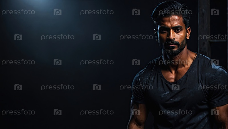 Индийский бодибилдер мужского пола, инструктор фитнес-гимназии, профессионализм, сильный, персонал, тренировка, спортивная одежда, клубный спортсмен, здоровый, рекламная зона, брендинг клуба