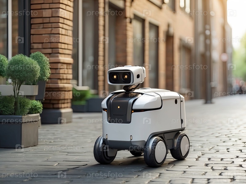 Компактный автономный робот-курьер на колесах доставляет небольшие посылки в городском ландшафте, доставку посылок, интеллектуальную логистику, транспорт последней мили