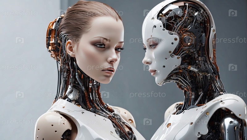 Два андроида-женщины, стоящие друг против друга в концепции взаимодействия с искусственным интеллектом, футуристическая высокотехнологичная гармония, белый фон для размещения текста выше