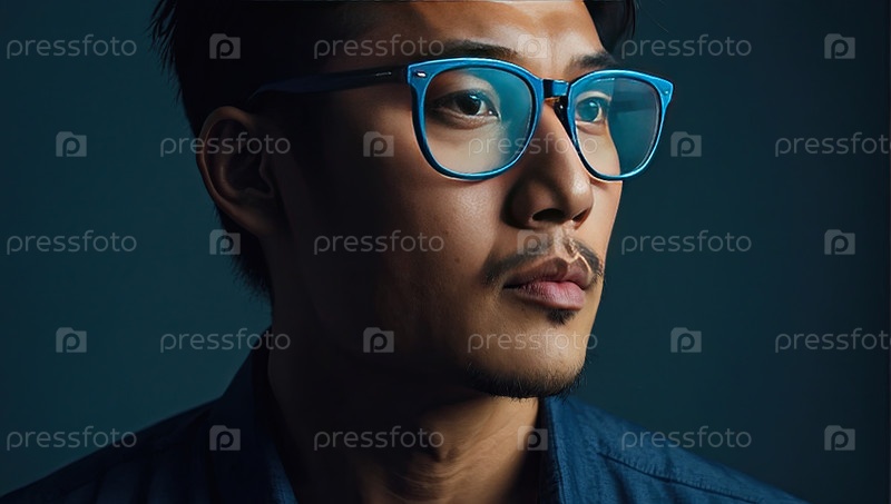 Молодой бизнесмен с голубыми очками, серьезный внешний вид, цифровая конфигурация офиса, профессиональное уход за зрением, технологии, оптическая коррекция, производительность бизнеса, стильный мужской портрет