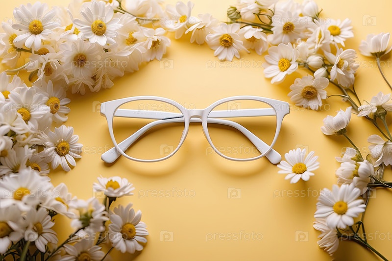 Белые модные очки с ромашками, желтый летний флатлей, цветочный оптический дизайн, свежий бутик для оптика, стильный баннер розничной торговли, кописпейс