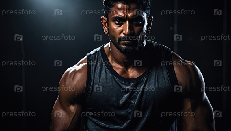 Индийский мужской фитнес-тренировщик с мышцами, тренажерный зал, личный тренер, клубный спортсмен, спортивная мотивация, профессиональное обучение, сотрудники команды, текстовое место, промо