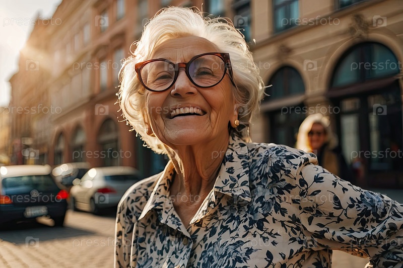 Нежная пожилая женщина с круглыми очками улыбается на улице города, поощряя поддержку при потере зрения и осведомленность о катаракте, поддерживающий образ жизни, область лечения, текстовое пространство