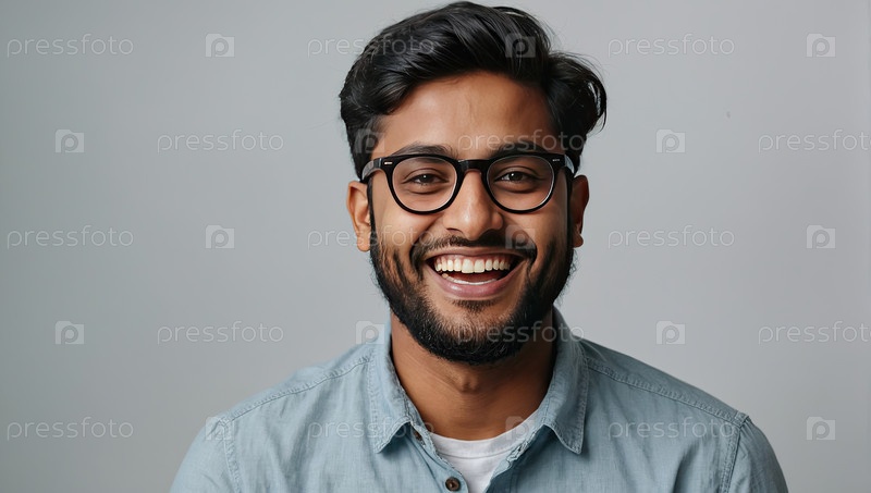Молодой южноазиатский мужчина с улыбающимися очками, светлый студийный фон, представляющий студента, страдающего цифровым напряжением глаз, современный образ жизни в кампусе, осведомленность о здоровье, пространство для текста