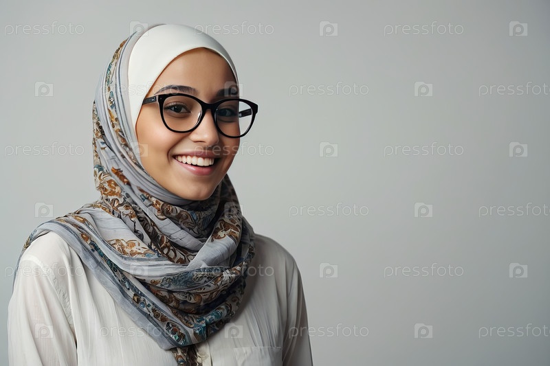 Портрет арабской женщины в узорчатом хиджабе и очках, улыбающейся в студии с пространством для текста, очков, ясности, уверенности, оздоровления, оптического ухода, консультаций