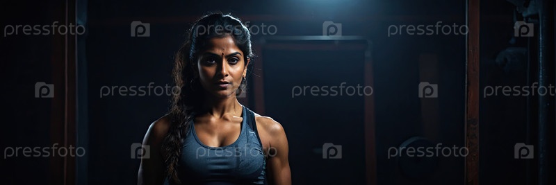 Портрет индийской женской фитнес-тренера в тренажерном зале, персональный тренер, персонал, профессионализм, спортивный клуб, здоровый, мотивация, брендинг, область для текста