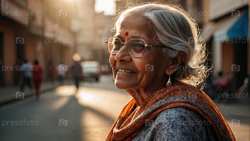 Городская пожилая женщина в медных очках, открытый коричневый шарф, городская улица, закат. глаукома, снижение остроты зрения, макулярное расстройство, центр помощи города, рекламный портал, блог-интервью copyspace