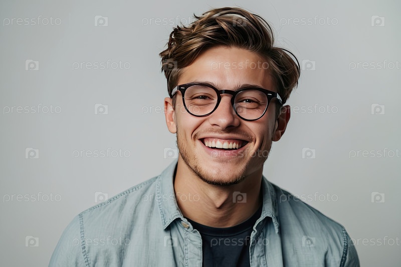 Улыбающийся модный студент университета в очках, фоном студии, борьба с ранней близорукостью, здоровье глаз и оздоровление, активная городская жизнь, предупредительное сообщение, текстовая зона