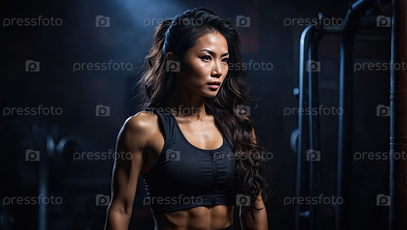 Азиатская тренерка женского фитнес- и оздоровительного клуба, здоровый спортсмен в тренажерном зале, коучинг, персонал, мотивация, реклама, использование портретов, пространство для текста