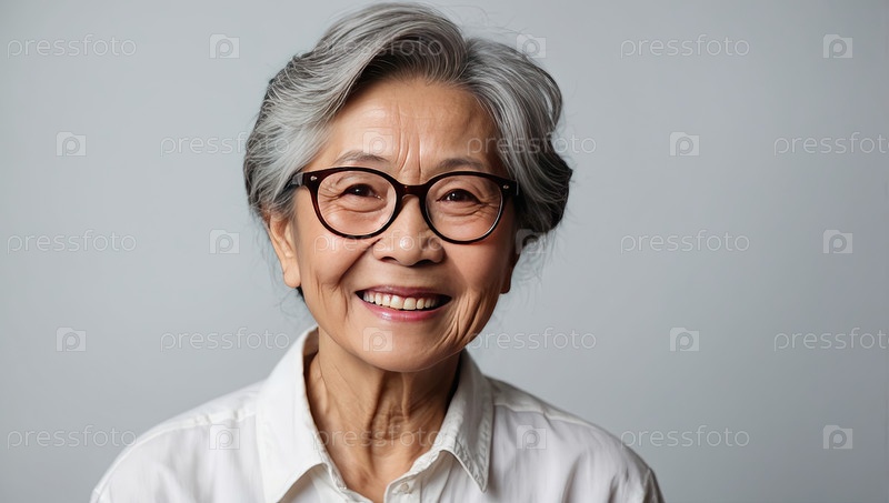 Зрелая азиатская женщина, улыбающаяся в очках, серый фон, представляющий собой поддержку зрения, здоровый образ жизни, уверенность в старении, продвижение здравоохранения, текстовое пространство