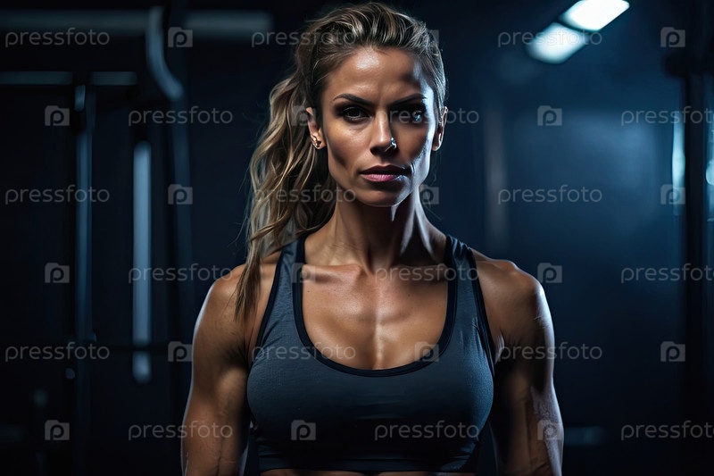 Портрет кавказского атлетического женского тренера в тренажерном зале, персонал фитнес-клуба, спортивная одежда, личный тренер, здоровый, профессиональный, промо/брендинг, пространство для брендинга