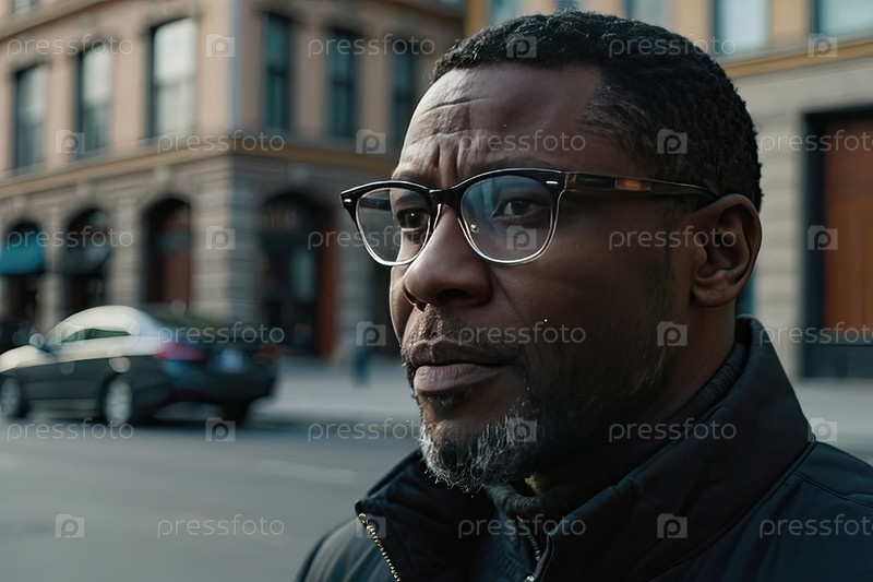 Афроамериканский бизнесмен в очках, открытая куртка, городская авеню, легкая улыбка, повседневная сцена