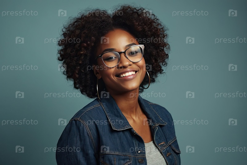 Афроамериканская девочка-подросток в коротком афро, яркие очки, синяя рубашка, нейтральный фон, застенчивая радостная поза. проблема зрения молодежи, круглая коррекция рамы, лучше всего подходит для городских медицинских проектов, объявления