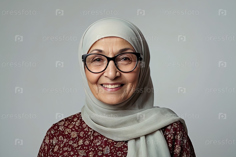 Арабская женщина в белом хиджабе и круглых очках, спокойно улыбающаяся на камеру с пространством для текста, профессиональный женский портрет по уходу за зрением и очков