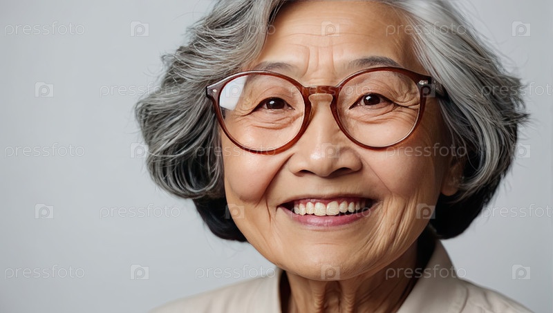 Старшая азиатская женщина с короткими волосами и очками, студийный серый фон, сообщение о здоровье, осведомленность о катаракте, продвижение здорового зрения для пожилых людей, текстовое пространство