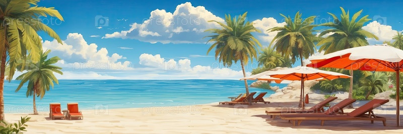 Яркий пляж с шезлонгами и зонтиками, отдых, безопасность от солнца, летний рекламный материал, текст можно разместить в водной или небесной зоне