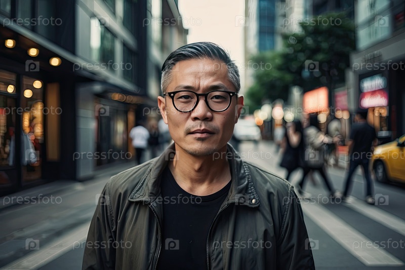 Мужчина средних лет из Азии в очках, темная куртка, стоящий на оживленной городской улице, серьезное лицо. усталость взрослого зрения, проблема оптического отбора, городский фон, пространство для текста