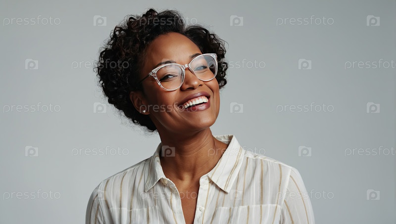 Игральная афроамериканская женщина в очках, белая рубашка, студия, улыбка, мягкая эмоция, чистый фон. проблемы со зрением взрослых, поиск очков, радость, место для текста