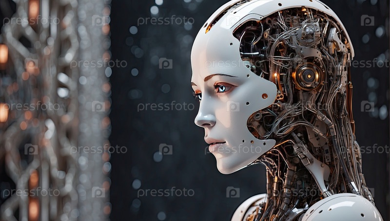 Боковой вид футуристического женского киберробота на размытом фоне с цифровыми элементами, искусственным интеллектом, большим копировальным пространством слева для текстов или брендинга
