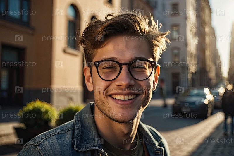 Модный молодой белый мужчина в круглых очках улыбается на улице, студент, сталкивающийся с цифровой усталостью глаз и близорукостью, городской фон, носимый стиль, текстовая зона