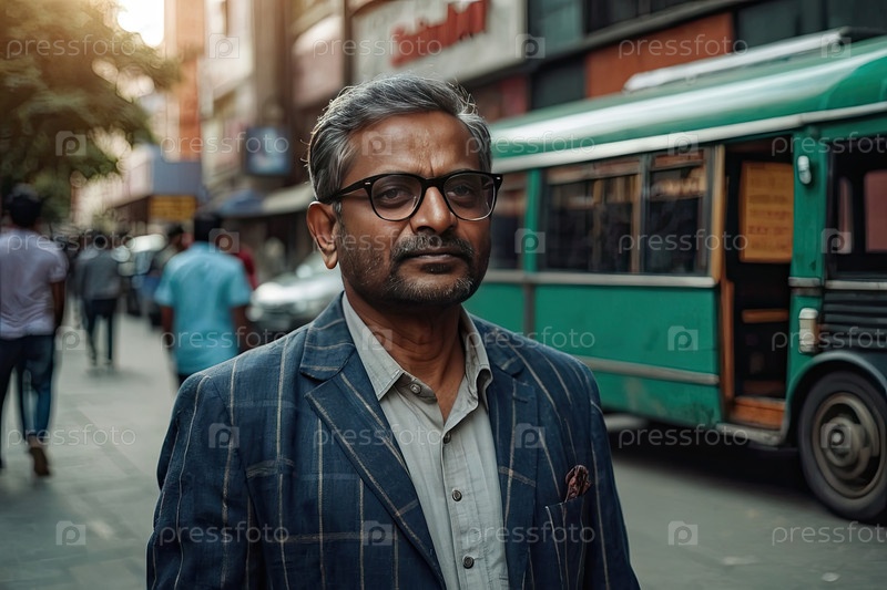 Взрослый индийский мужчина в очках, полосатый спортивный халат, ожидание на переполненной улице, скрещенные руки, нейтральный. необходимость ухода за зрением у взрослых, принятие решений о очках, занятая городская обстановка
