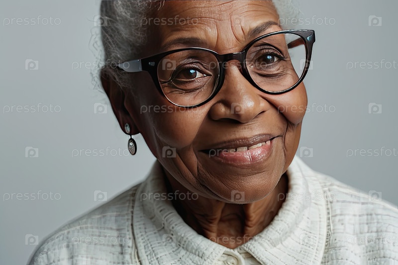 Старшая чернокожая женщина с очками, нежная улыбка, серый фон, представляющий поддержку пресбиопии, уход за зрением, дружественное медицинское сообщение, текстовая зона
