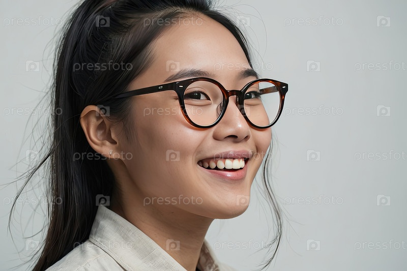 Современная азиатская девушка с прозрачными модными очками, высокий коньковый хвост, смеяться, студийный портрет. оптический дефицит, модная рама для молодежи, стильный аксессуар, СМИ, оптик промо-дизайн