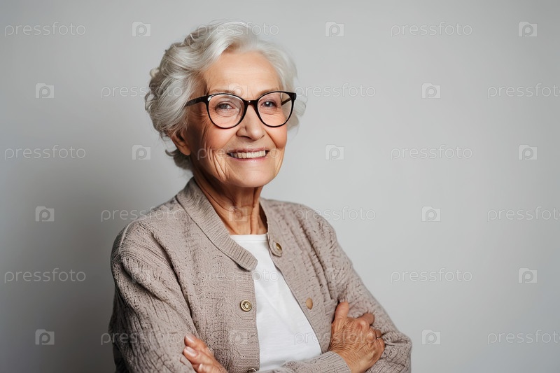 Пожилая женщина в пастельном кардигане и очках, сложенные руки, улыбающаяся в студии Классические проблемы со зрением, стиль рамы, старший комфорт, сообщение о здоровье, выдержка из журнала, шаблон баннера