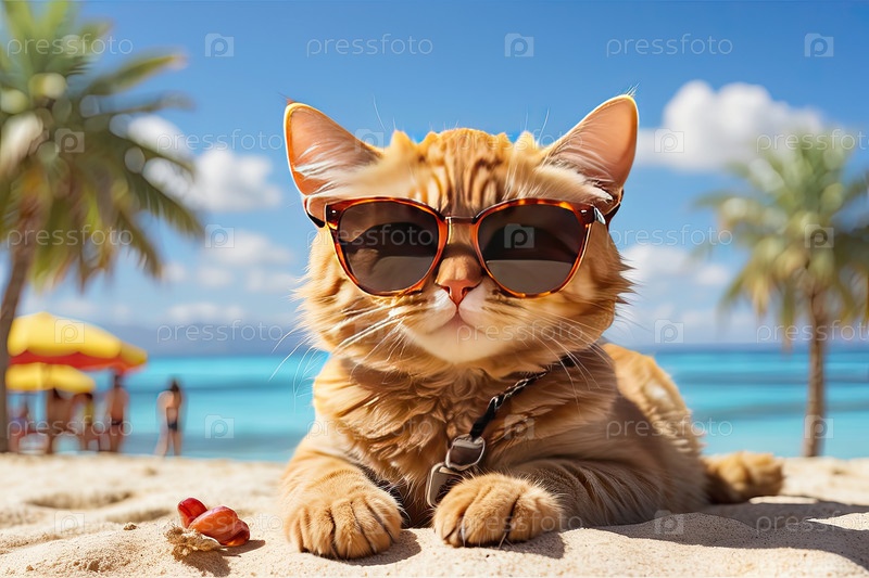Кошка со скорлупой на пляже, полет с животными, дружественный к домашним любимцам отель, защита от солнца для питомцев, временные возможности посадки, промо-акция, информация для туризма и блоги