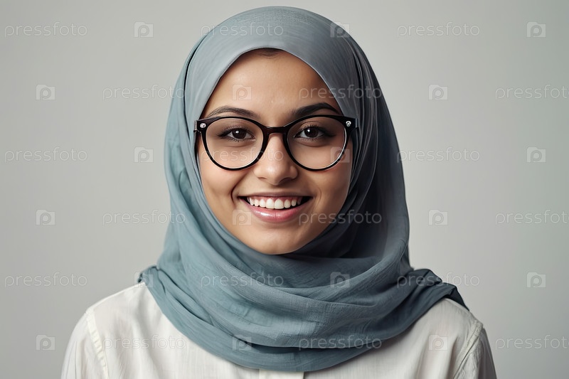 Молодая арабская женщина в синем хиджабе и очках улыбается в студии с пространством для текста, очков, ухода за зрением, уверенности, здорового образа жизни, положительного настроения, консультаций