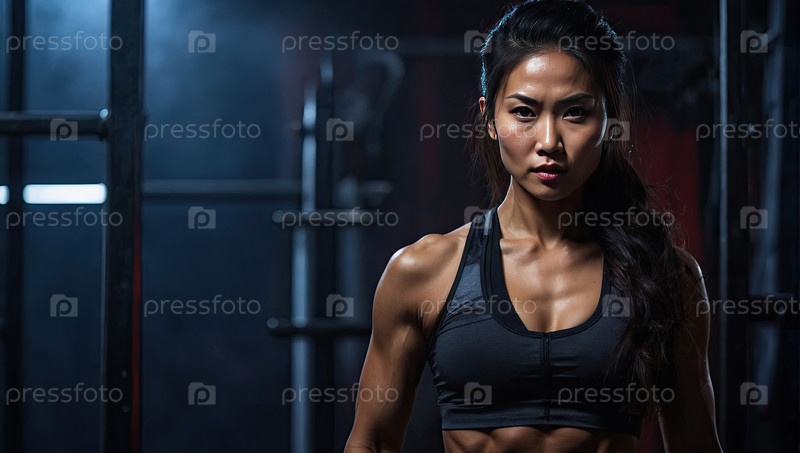 Спортивная азиатская женщина-тренер в тренажерном зале, сила, оздоровление, личная тренировка, здоровый образ жизни, тренер, персонал фитнес-клуба, использование рекламы, текстовая область