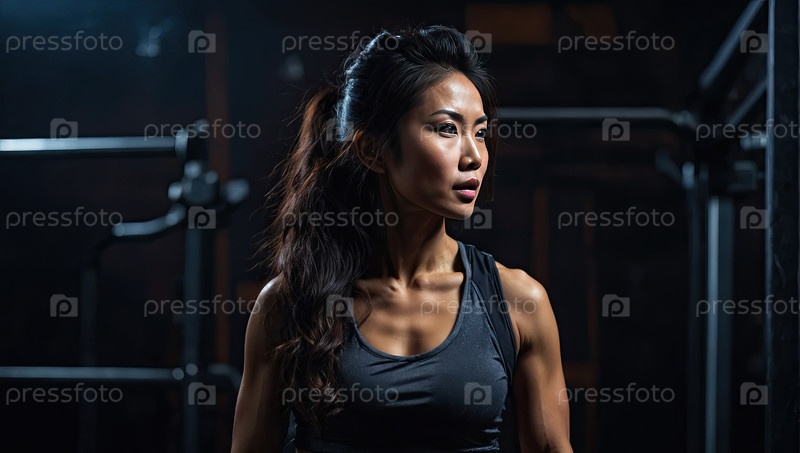 Азиатская женщина фитнес-тренера в тренажерном зале, атлетический тренер, личный тренер, спортивная одежда, мотивация к спорту, оздоровление, персонал, реклама, text provided