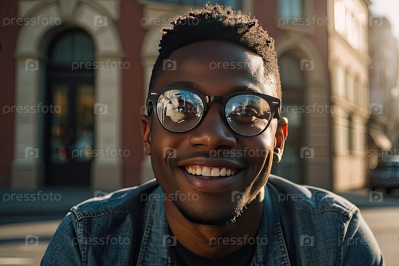 Молодой чернокожий мужчина в модных очках, старый город, закат солнца, креативный студент страдает от цифровой усталости глаз, городской технологический образ жизни, оздоровительный путь, зона текстового баннера