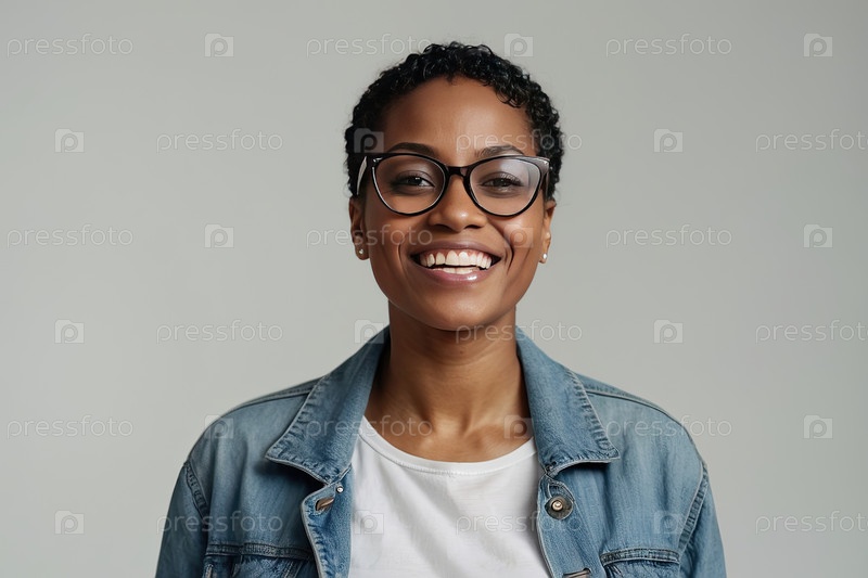Молодая афроамериканская женщина в очках, улыбающаяся положительно, повседневная куртка, студия. проблема со зрением, выбор рамы, оптометрическое решение, счастливая эмоция, серый фон, копирайтинг