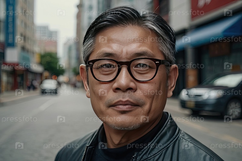 Зрелый азиатский мужчина в очках, одетая куртка, городская улица, мягкая улыбка. проблемы со зрением у взрослых, поиск очков, положительное настроение, городской фон, пространство для текста