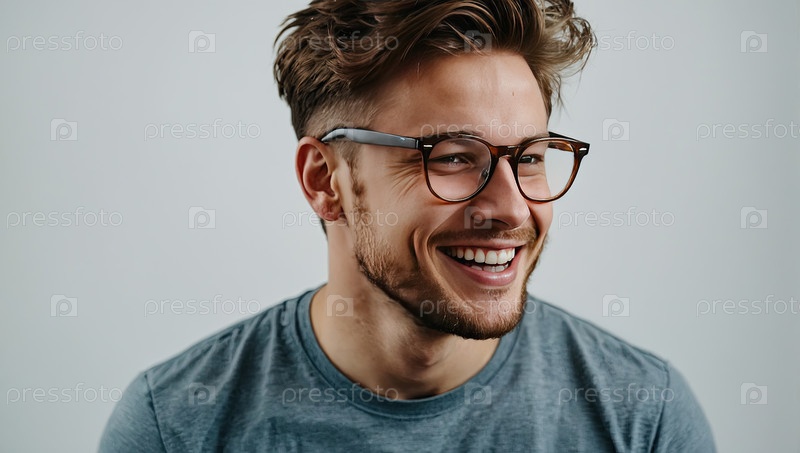Молодой студент-мужчина с очками, светлый фон, синдром компьютерного зрения, тревога цифровой работы, поощрение здоровья глаз, современная студенческая жизнь, текстовая зона