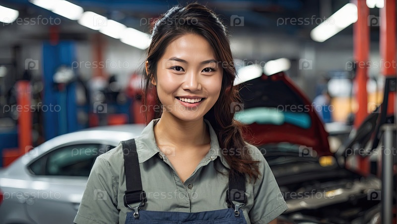 Улыбающаяся азиатская женщина автомеханик в светло-синей форме на автомобильном сервисе, профессиональный техник, уверенный сотрудник, практичный персонал, зона для текста