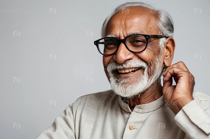 Индийский мужчина с очками, белая борода, легкий этнический курта, радостный, студия. старшая проблема со зрением, классическая оптическая форма, страница культурного здоровья, объявление сообщества, пространство для текста баннера