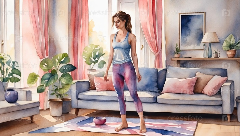 Акварельная иллюстрация женского фитнеса в уютном доме, домашняя тренировка, оздоровление, комфорт, здоровый образ жизни, реклама, блоги, баннеры, содержание для здоровья