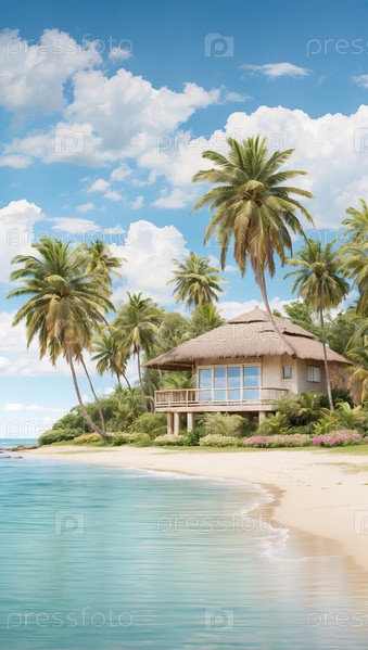 Пляжный бунгало на песчаном берегу, аренда отдыха со всем включенным, частное семейное райское убежище, цифровая иллюстрация мультфильмов, тихое проживание в отеле